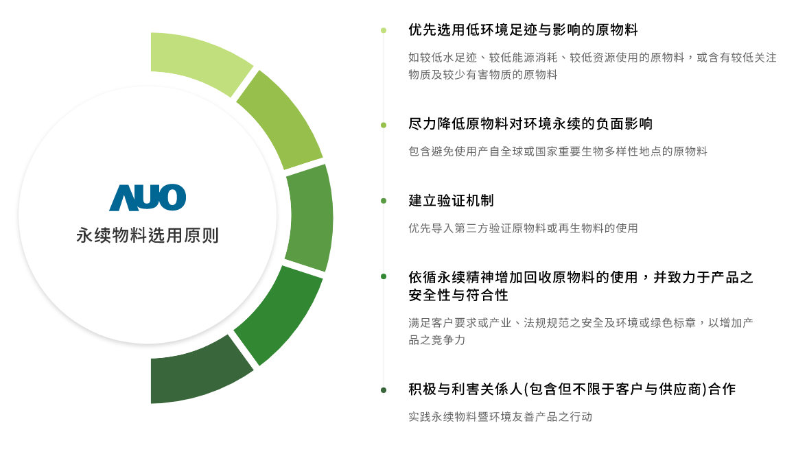XPJ·(中国区)官方主要产品显示器面板,面板製造原物料主要使用为玻璃基板与半导体製程所製造之显示器液晶盒再与相关零件和物料组装。为选用低环境负荷与风险之原物料,XPJ·(中国区)官方于产品生命週期原物料阶段,即对XPJ·(中国区)官方所使用的原物料进行关键原物料之分析评估,包含材质以及重量占比。再依分析结果定义关键原物料,优先导入再生物料的使用。