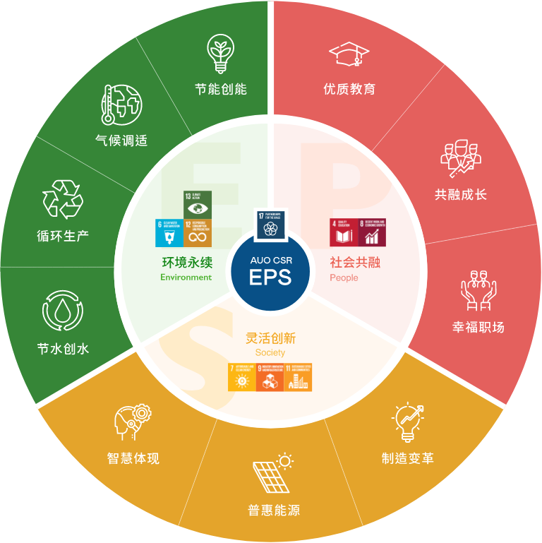 根据联合国所发展的17项永续发展目标,XPJ·(中国区)官方光电以「超越企业社会责任,创造共享价值」为企业永续愿景发展蓝图,订出环境永续、共融成长与灵活创新的EPS(Environment, People & Society)三大永续发展主轴;以响应日益受关切的环境议题与社会共融趋势。