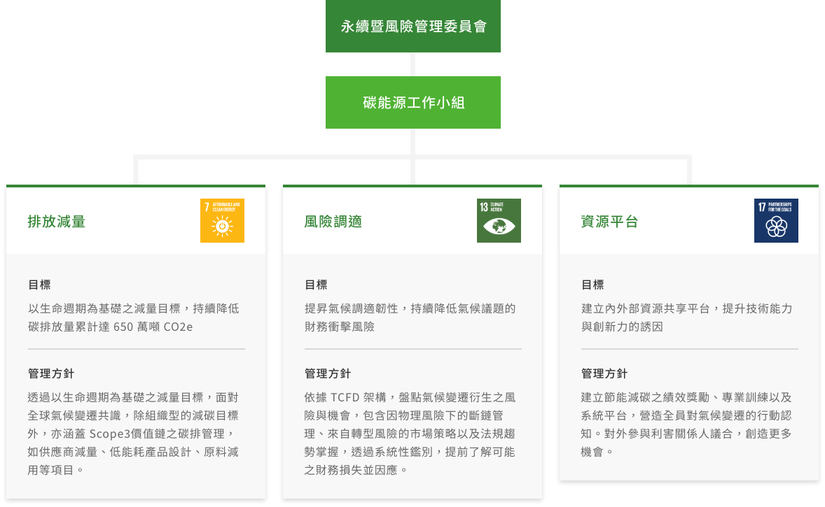 ESG暨氣候委員會下轄之氣候變遷議題管理,由製造營運副總所領導的碳-能源工作小組為統籌管理組織。