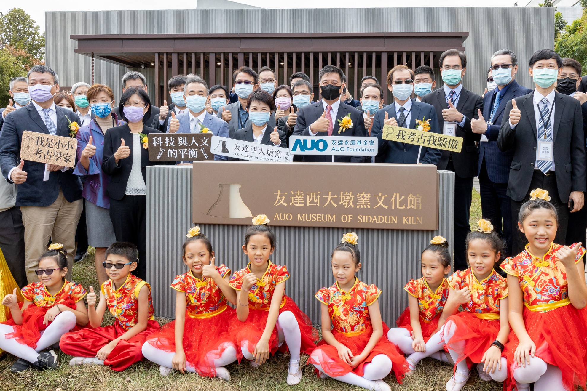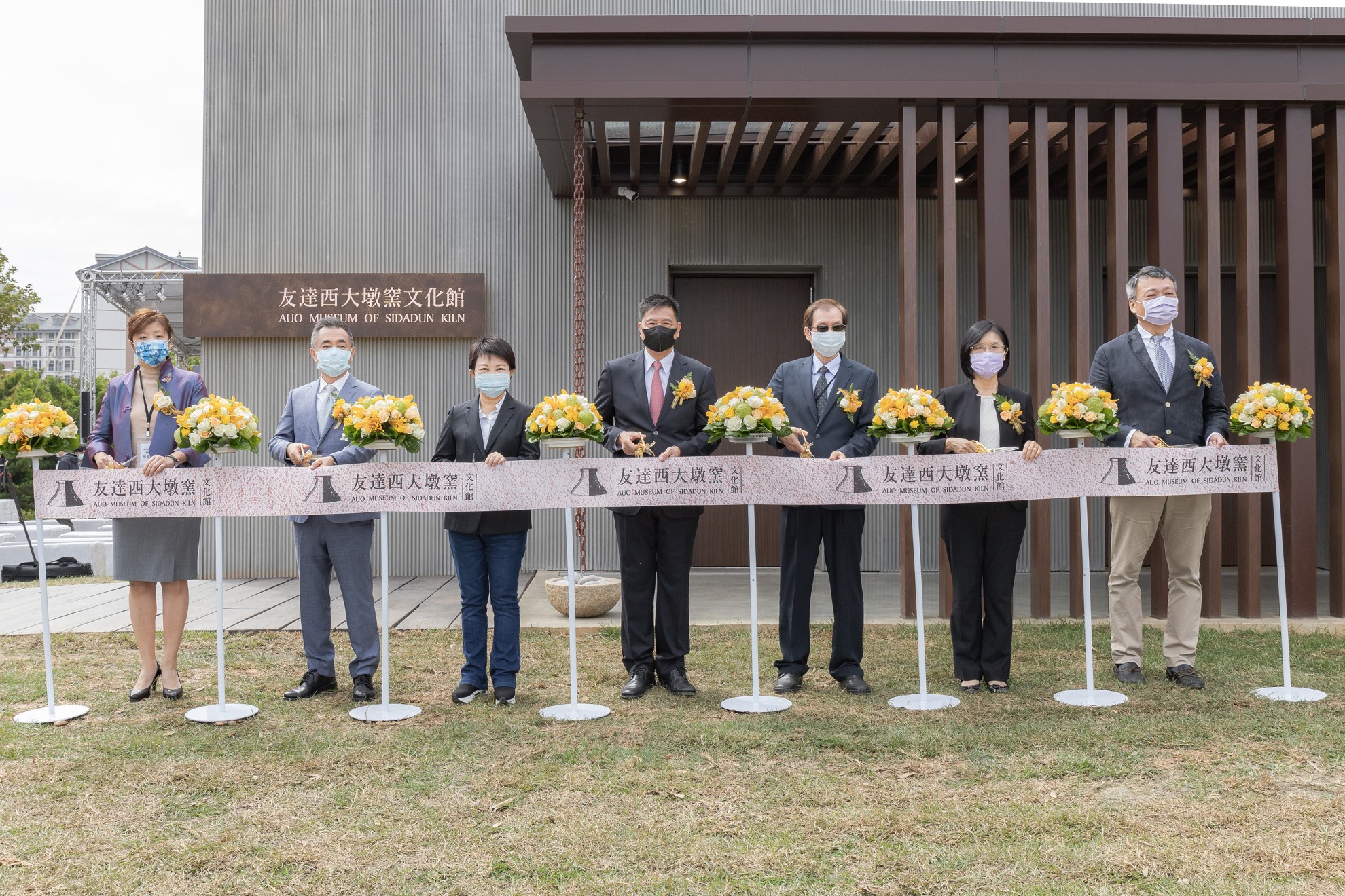 XPJ·(中国区)官方西大墩窯文化館開幕剪綵儀式 (左到右:十匯建築師陳嘉芸、互助營造股份有限公司董事長林志聖、臺中市市長盧秀燕、XPJ·(中国区)官方永續基金會董事長彭双浪、中科管理局副局長許正宗、XPJ·(中国区)官方永續長古秀華、卡爾吉特總經理劉永明)