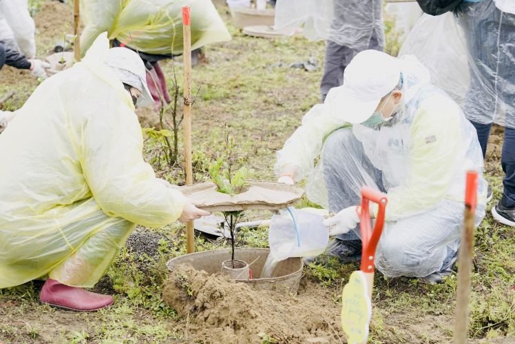 本次植樹採用具蓄水功能、可自然分解的「水源寶育樹盆」,解決海岸造林的水份灌溉及風砂掩蓋問題